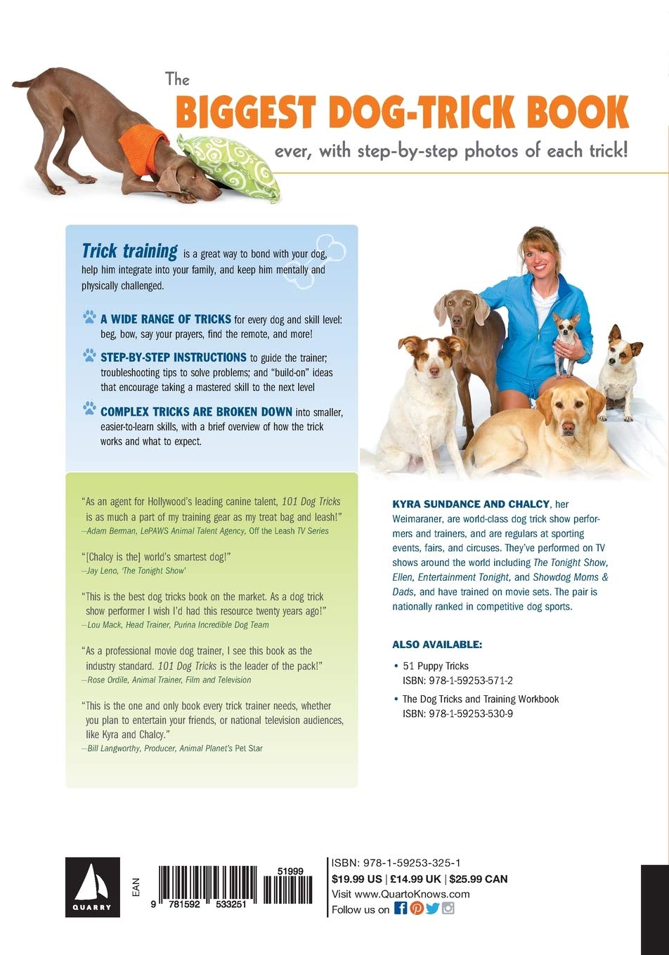 101 Dog Tricks is an international bestseller in 18 languages with over a half-million copies sold worldwide! This beautifully designed book features step-by-step instructions with easy-to-follow color photos of each step. Each trick is rated with a difficulty rating and prerequisites to get you started quickly. Tips and troubleshooting boxes cover common problems, while Build on it! ideas suggest more complicated tricks that build on each new skill.Tricks range from simple ones like Sit, Shake Hands, Fetch, and Roll Over, to extraordinary ones like Tidy Up Your Toys into the Toybox and Get a Soda from the Fridge. Organized by theme, it's easy to find the next trick to work on with your dog. Just a few of the themes to choose from:Chores, such as Newspaper Delivery and Get Your LeashFunny tricks, such as Doggy Push-ups and Play the PianoDancing, such as Moonwalk and Chorus Line KicksLove, such as Kisses and Wave GoodbyeTrick training will help you bond with your dog and integrate him or her into your family. Tricks also help keep your dog mentally and physically healthy and establish paths of communication between you. Many tricks build skills used in dog sports, dog dancing, and dog therapy work. 101 Dog Tricks will inspire you to do more with your dog! Millions of people have found success with Kyra Sundance's step-by-step techniques—and you can, too.