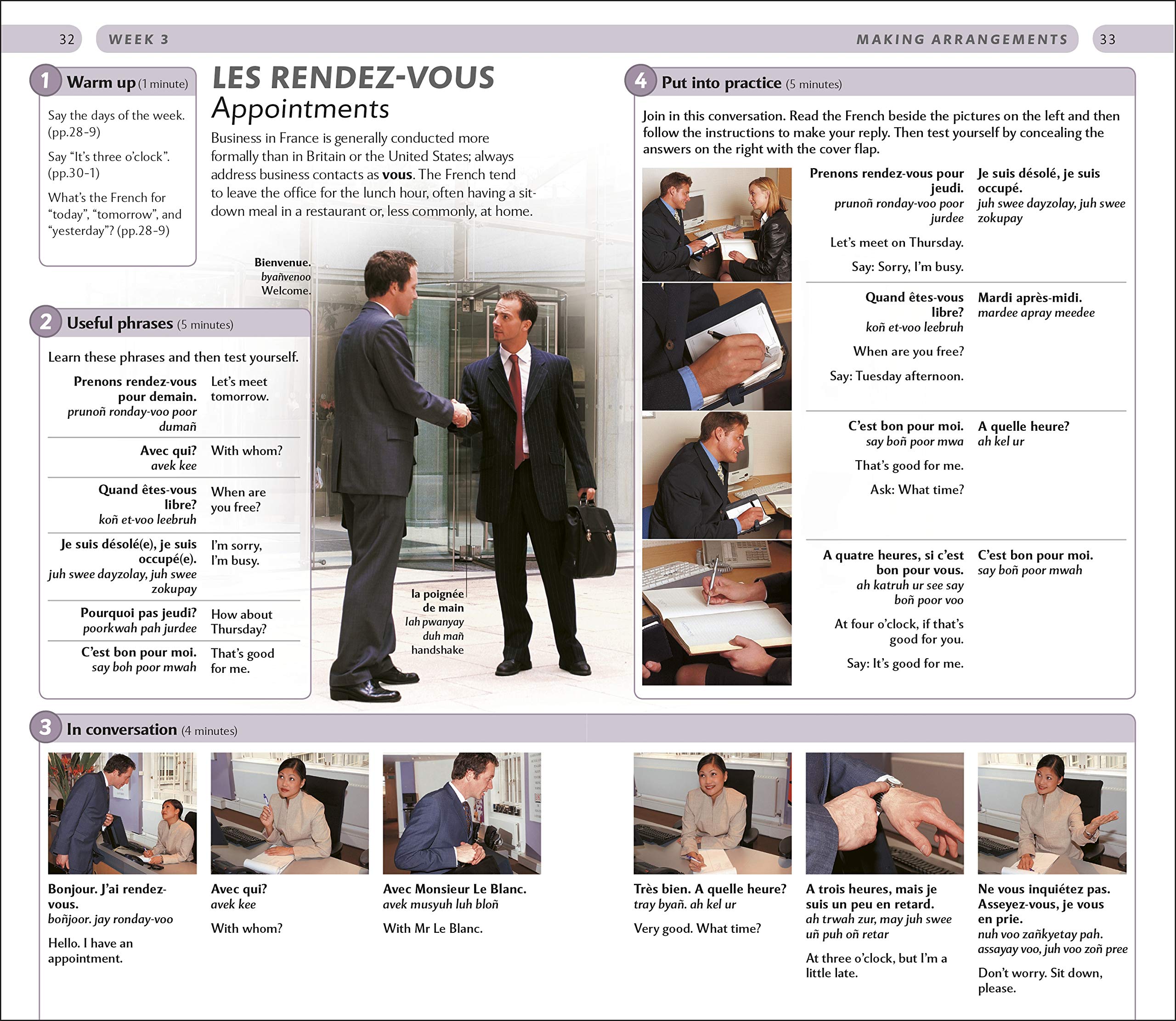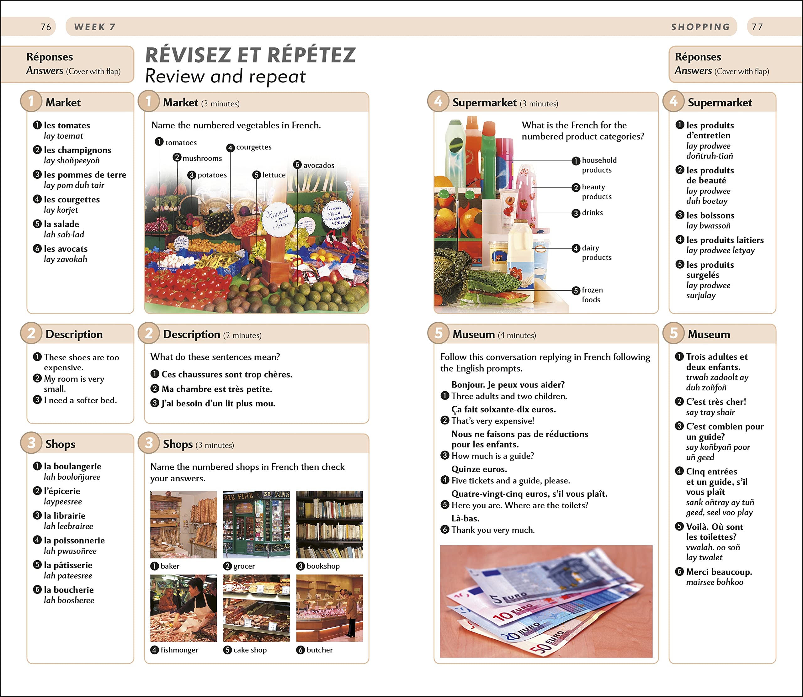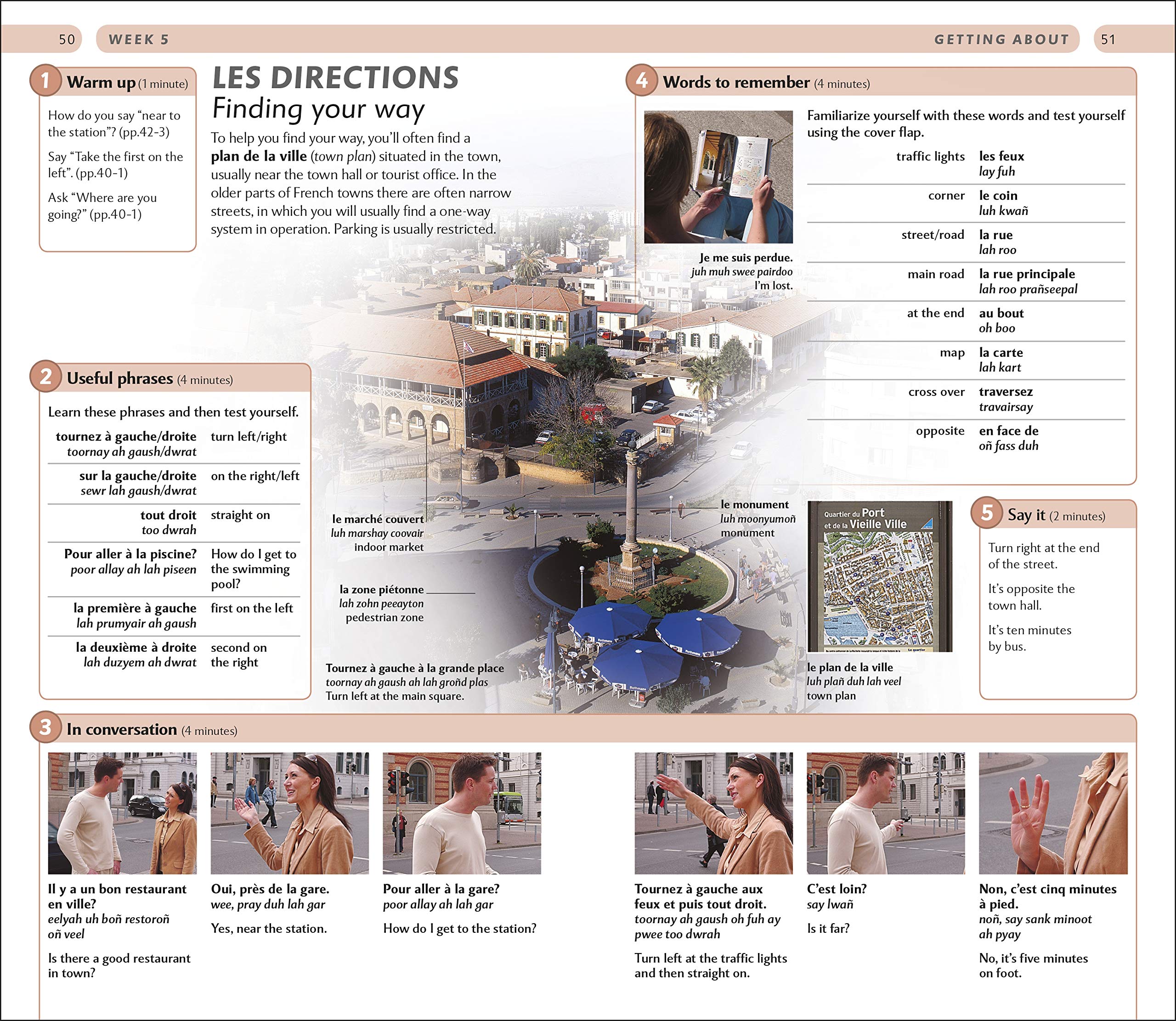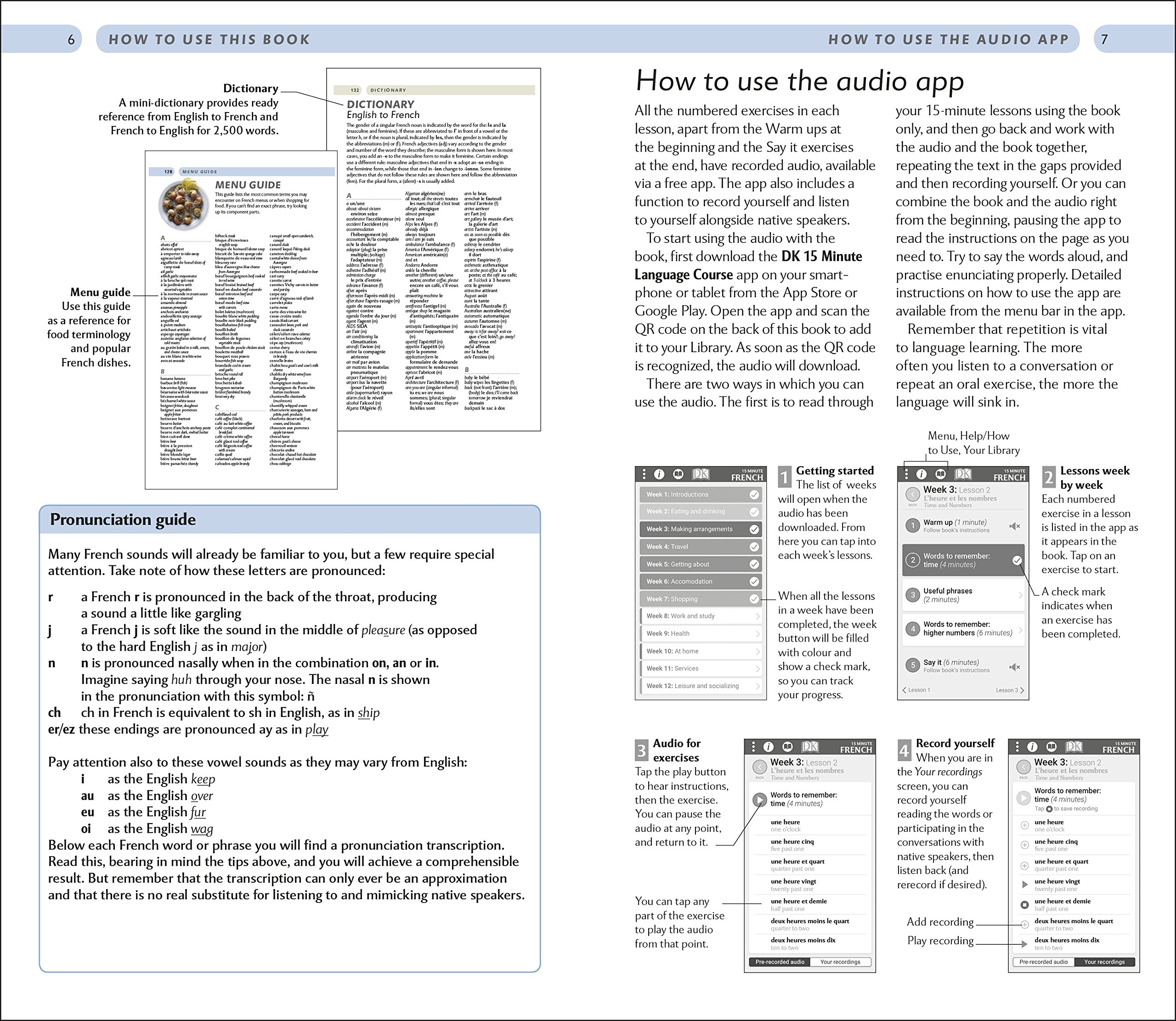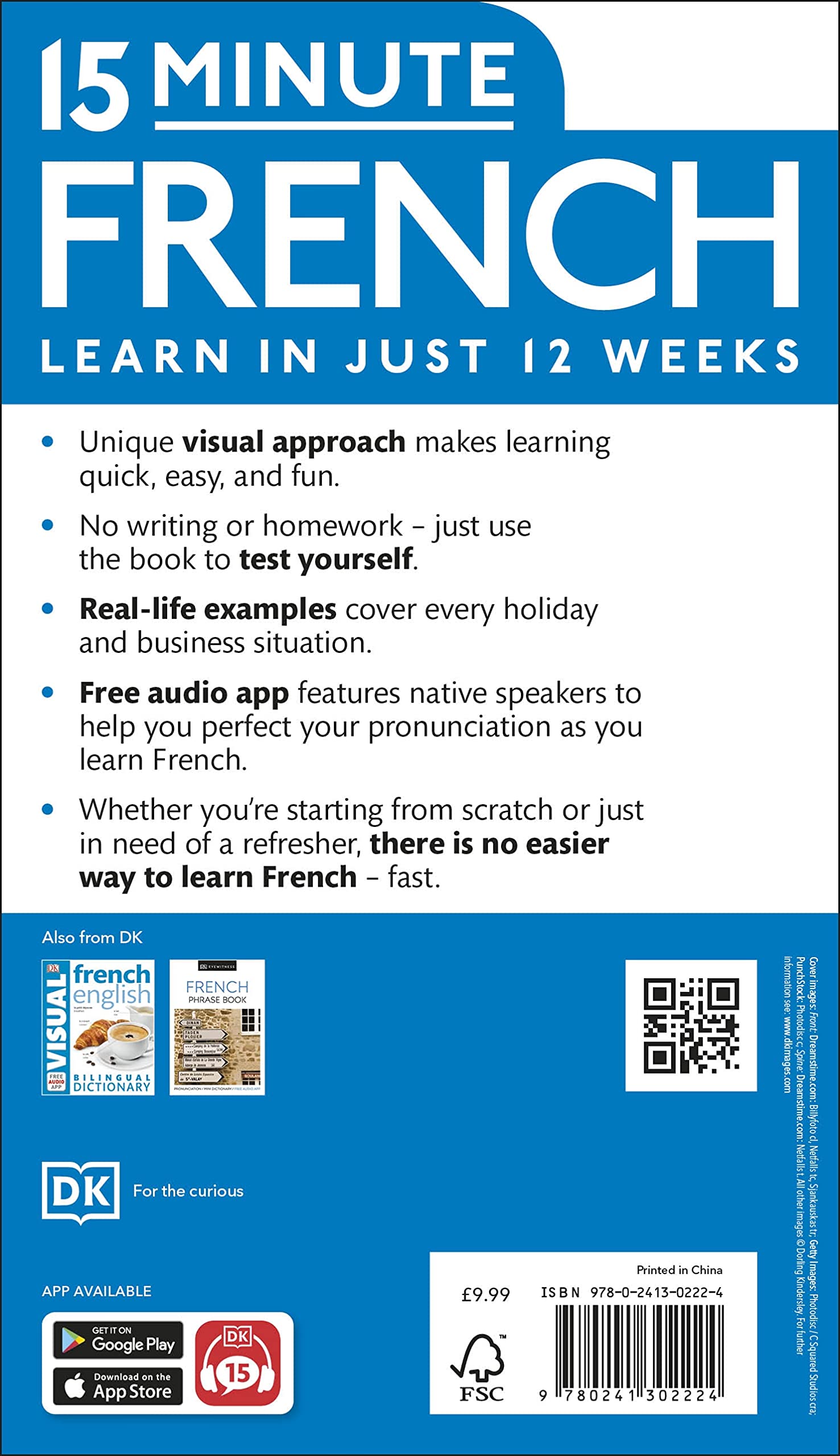 The perfect book for anyone who wants to learn French fast. Comes with a free downloadable audio app for Apple and Android phones, enabling learners to hear words and phrases spoken by native French speakers.12 themed chapters are broken down into 15-minute daily lessons, spanning a range of practical themes, from socialising to doing business. Each lesson combines French vocabulary and grammar essentials with full-colour photographs for a user-friendly, accessible language guide. The ideal French language course for beginners, the 15-Minute language series will teach you how to speak a new language in just 12 weeks.Topics covered: introductions, eating and drinking, making arrangements, travel, getting about, accommodation, shopping, work and study, health, at home, services, leisure and socialising, with a menu guide and two-language dictionary.