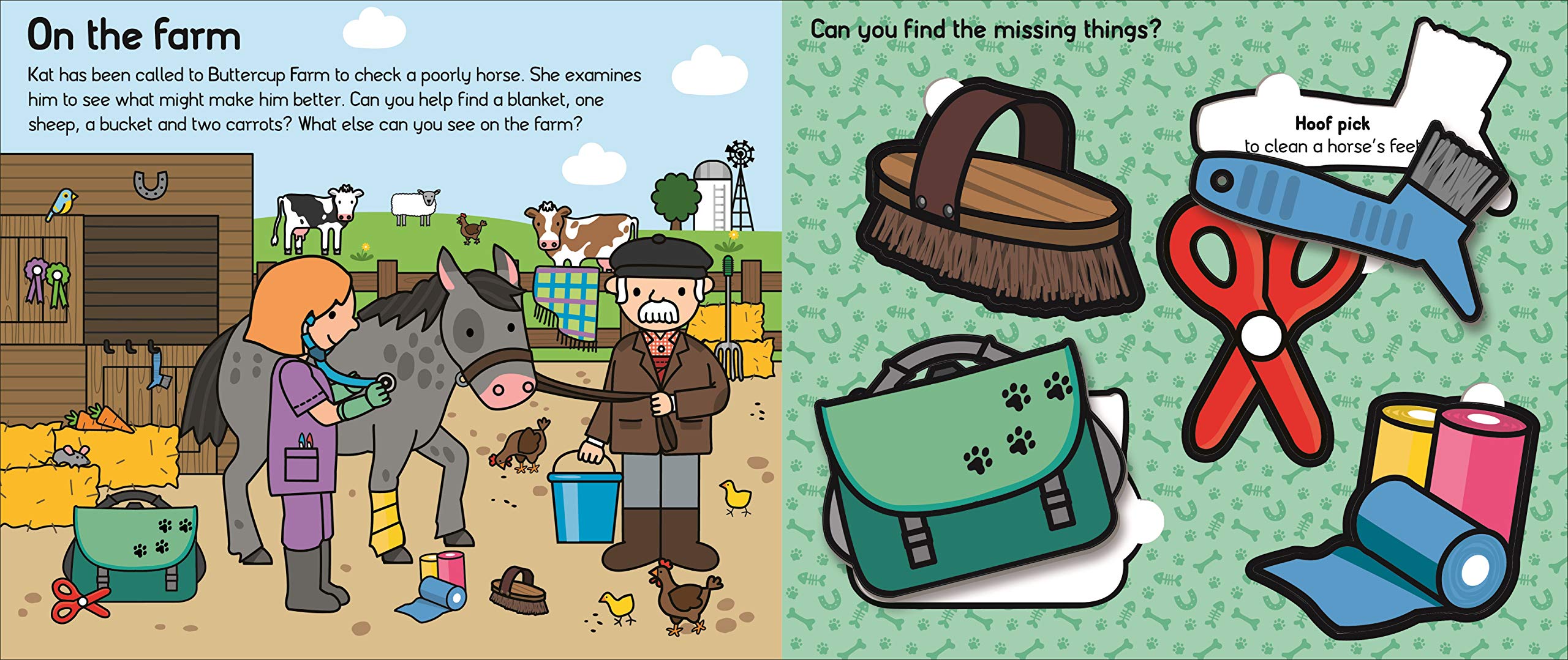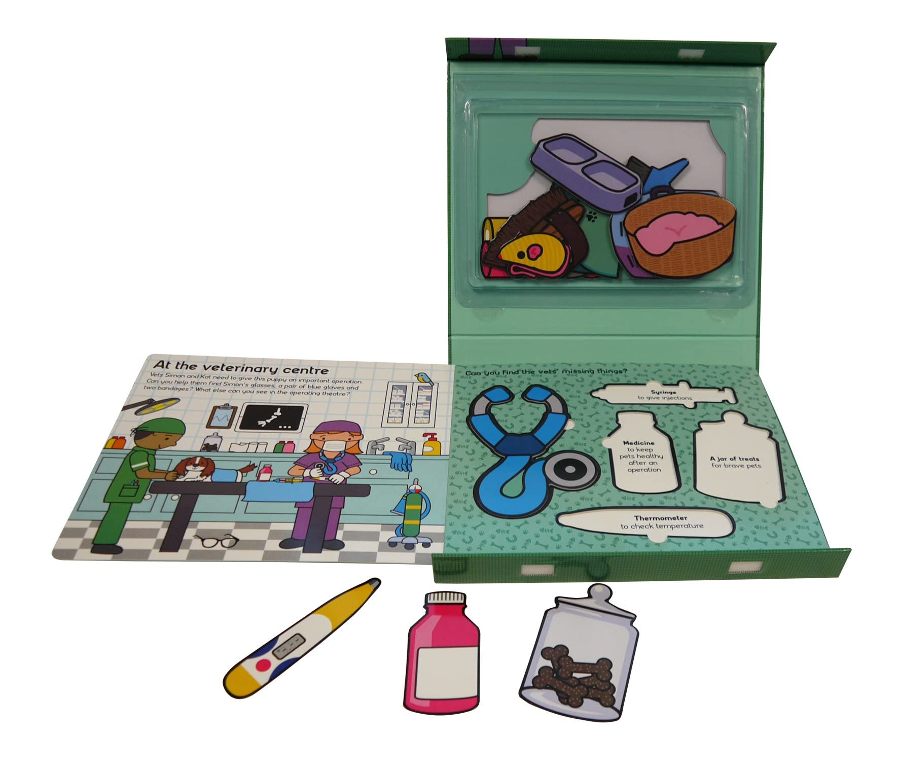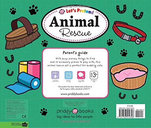 It's another busy day for vets Kat and Simon and the Rescue Centre volunteers! Inside this creative play set, the big board book has three busy scenes full of things to look for and find, as the vets prepare a puppy for an operation, Kat takes a trip to Buttercup Farm to treat a sick horse, and volunteers Joey and Jill get two kittens ready to go to a new home. This fabulous set for budding vets comes with 15 sturdy cardboard pieces which can be used both to match to the spaces on the book pages and for independent, imaginative play.