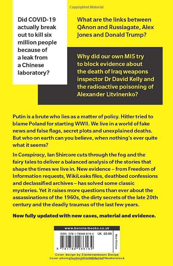 Did COVID-19 actually break out to kill 6 million people because of a leak from a Chinese laboratory? What are the links between QAnon and Russiagate, Alex Jones and Donald Trump? Why did MI5 try to block evidence about the death of Iraq weapons inspector Dr David Kelly and the radioactive poisoning of Alexander Litvinenko? Putin is a brute who lies as a matter of policy. Hitler tried to blame Poland for starting WWII. We live in a world of fake news and false flags, secret plots and unexplained deaths. But what on earth can you believe, when nothing's ever quite what it seems? In Conspiracy, Ian Shircore cuts through the fog and the fairy tales to deliver a balanced analysis of the stories that shape the times we live in. New evidence - from Freedom of Information requests, WikiLeaks files, deathbed confessions and declassified archives - has solved some classic mysteries. Yet it raises more questions than ever about the assassinations of the 1960s, the dirty secrets of the late 20th century and the deadly traumas of the last few years.Now fully updated with new cases, material and evidence.