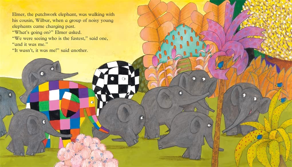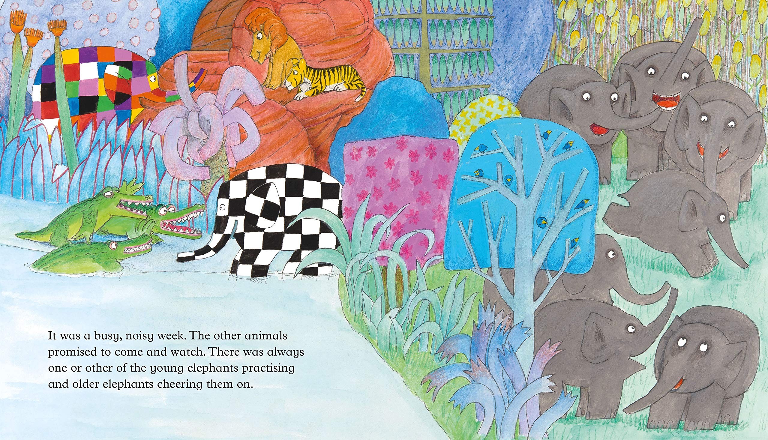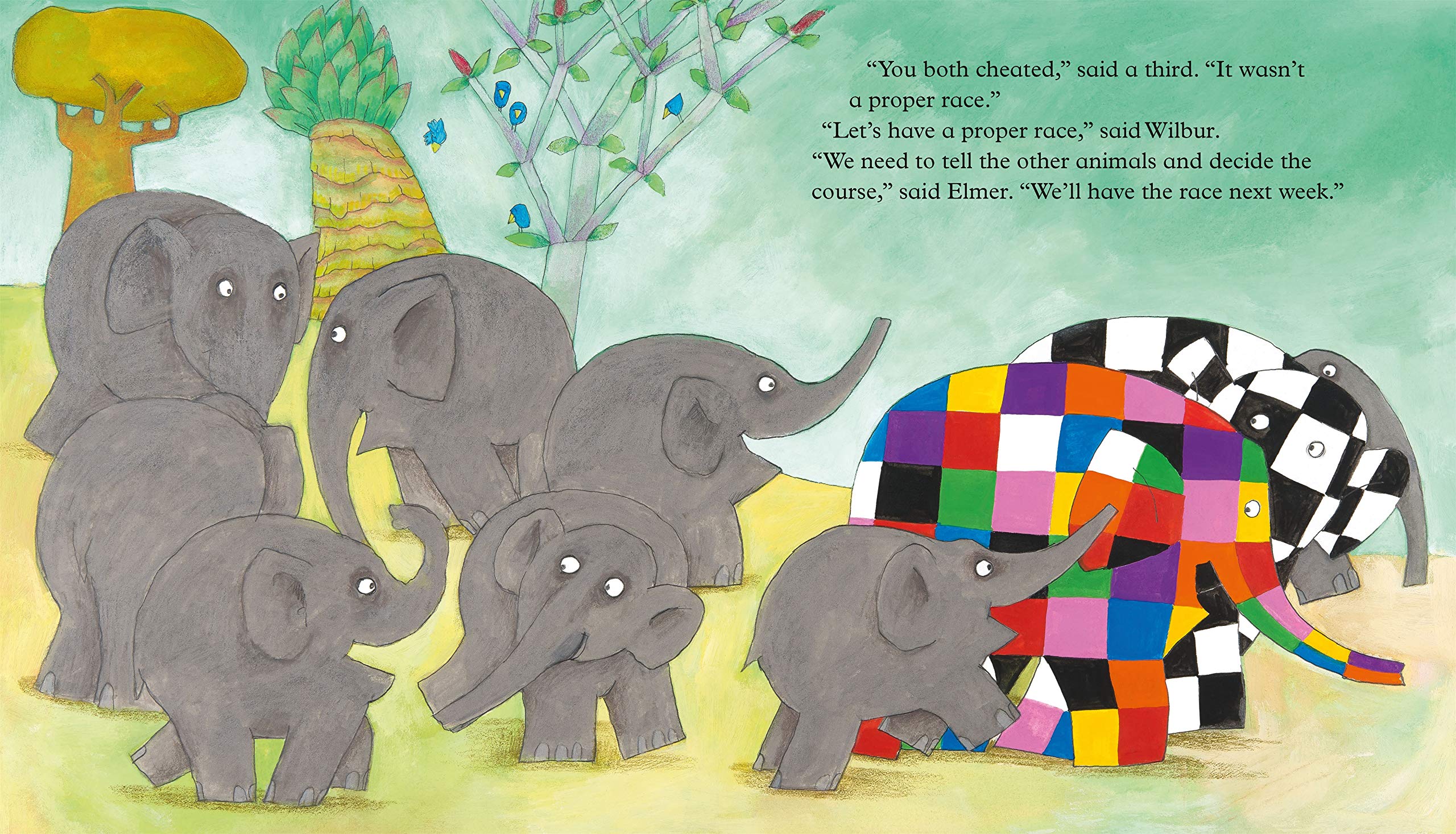 The young elephants want to prove who is the fastest, so Elmer and Wilbur organise a race. Each decorated a different colour, the racers set off around the course and discover things about themselves – Blue may be first and Orange second, but White is kind, Pink and Violet are funny and Yellow is a cheat. Luckily Yellow also learns he is very good at saying sorry, so each young elephant gets a medal from Elmer.