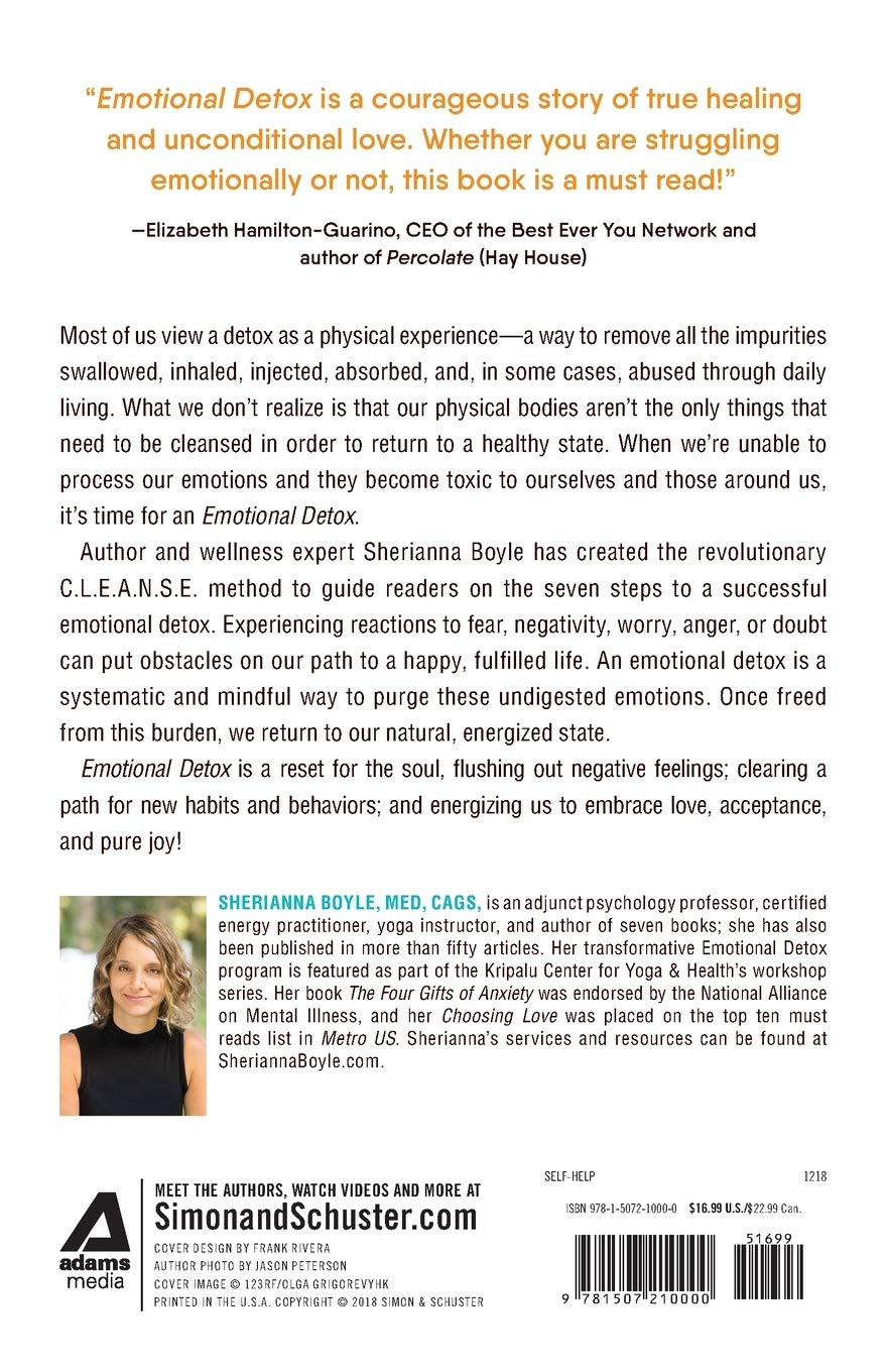 Flush out negativity and clear a path for new positive habits, behaviors, and emotions with certified energy healer, yoga instructor, and psychology professor Sherianna Boyle’s emotional detox program, C.L.E.A.N.S.E.—as featured on YogaJournal.com.When we think of a detox, we usually think of a physical experience. But it’s not just our physical bodies that need to be cleansed of the impurities we encounter and absorb in our daily lives—it’s our minds too. When we find ourselves unable to process our negative emotions and feel them becoming toxic to ourselves and those around us, it’s time for an Emotional Detox, a mindful and systematic guide to freedom from these troublesome feelings. Wellness expert Sherianna Boyle has created the revolutionary the 7-step C.L.E.A.N.S.E. method to help you rid yourself of negativity, fear, worry, anger, and doubt, and guide you back toward a natural, energized state of pure joy and acceptance. Learn how to Clear your pathways, Look inward, Emit positivity, Activate, Nourish, Surrender, and Ease your way into your best self and a happier and healthier life. Emotional Detox “will wake you up, turn your views upside down, while providing you with life changing tools and insight” (Elizabeth Hamilton-Guarino, CEO of Best Ever You Network and author of Percolate).