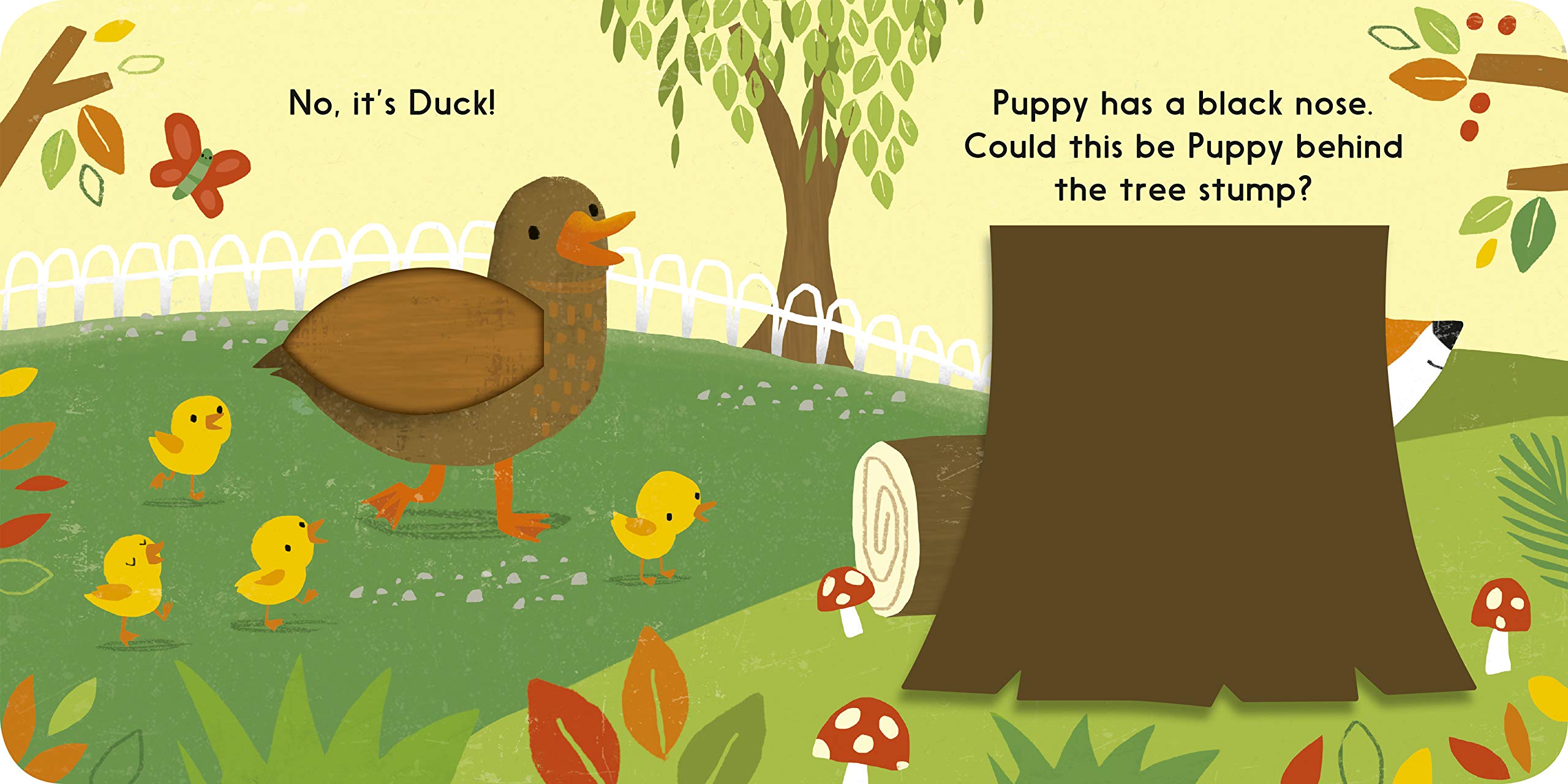 Puppy is hiding. Let's go and find him! There are lots of animals playing in the park, but could any of them be Puppy? Peek through the pages and lift the touchy-feely felt flaps to find out!