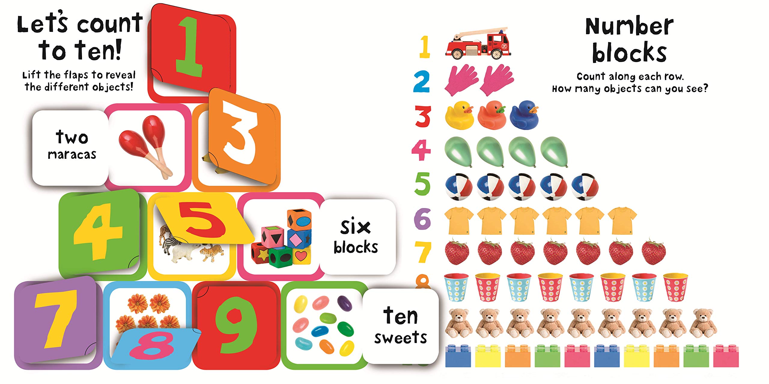 The perfect tool to help babies and toddlers learn their first numbers and develop early counting skills. Question prompts on every page encourage children to lift the sturdy, shaped flaps - over 50 in total - which reveal hidden pictures, numbers and things to count. The book focuses on developing sorting, matching and counting skills from one to ten, as well as introducing numbers up to 100 on the last pages.