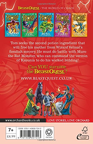 Battle fearsome beasts and fight evil with Tom and Elenna in the bestselling adventure series for boys and girls aged 7 and up.Tom now seeks the second potion ingredient that will free his ailing mother from Wizard Velmal's fiendish sorcery. He must battle against Muro the Rat Monster, who can command the vermin of Kayonia to do his wicked bidding!There are SIX thrilling adventures to collect in the Beast Quest: The World of Chaos series: Komodo the Lizard King; Muro the Rat Monster; Fang the Bat Fiend; Murk the Swamp Man; Terra Curse of the Forest; Vespick the Wasp Queen.If you like Beast Quest, check out Adam Blade's other series: Team Hero, Sea Quest and Beast Quest: New Blood!