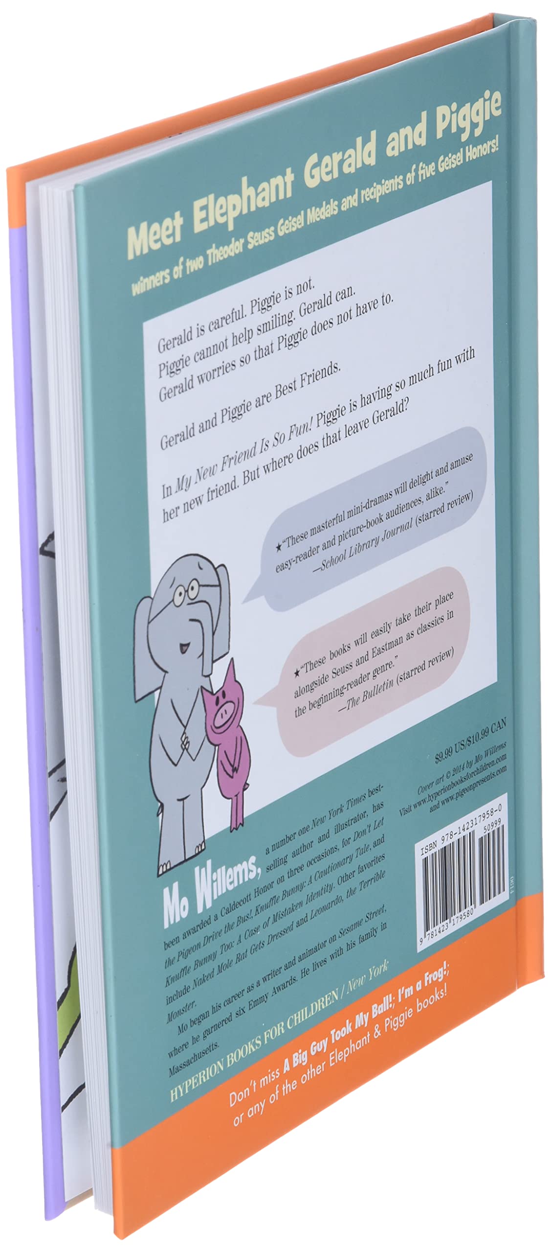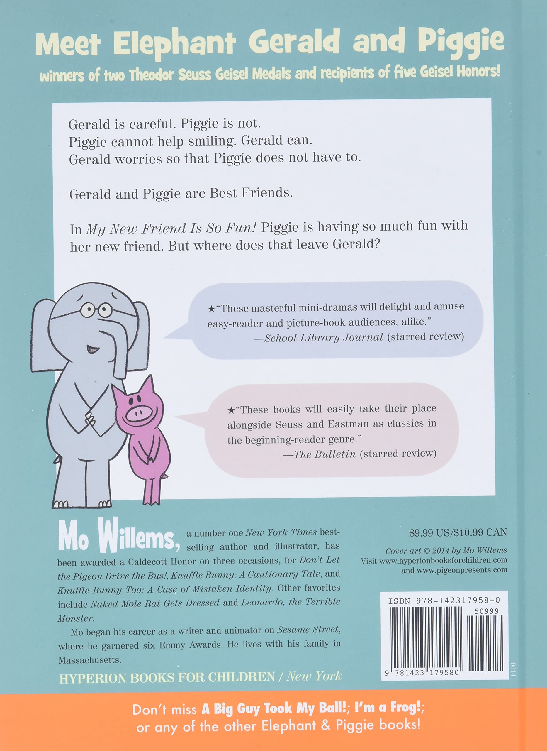 Gerald is careful. Piggie is not.Piggie cannot help smiling. Gerald can.Gerald worries so that Piggie does not have to.Gerald and Piggie are best friends.In My New Friend Is So Fun!, Piggie has found a new friend! But is Gerald ready to share?