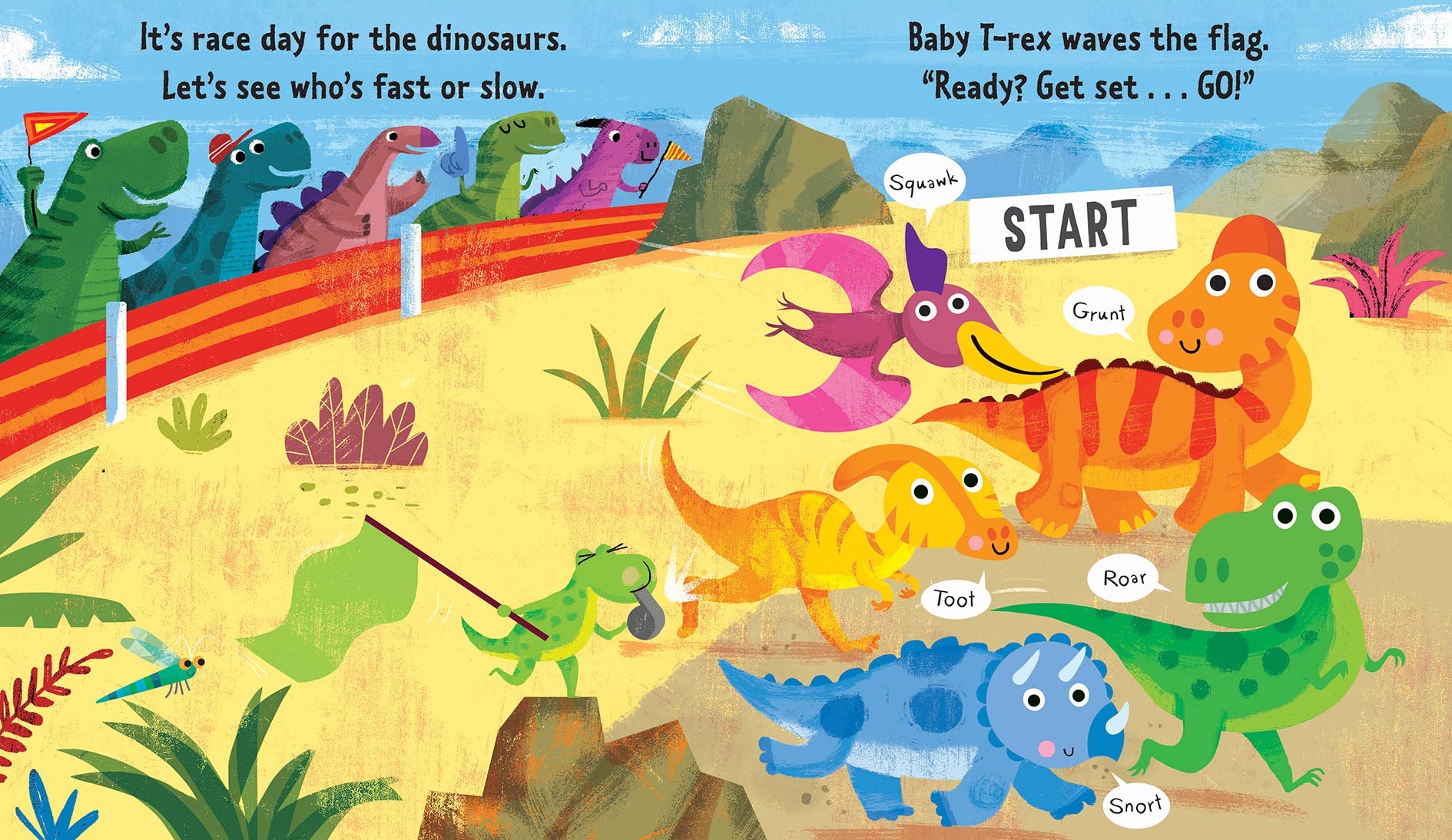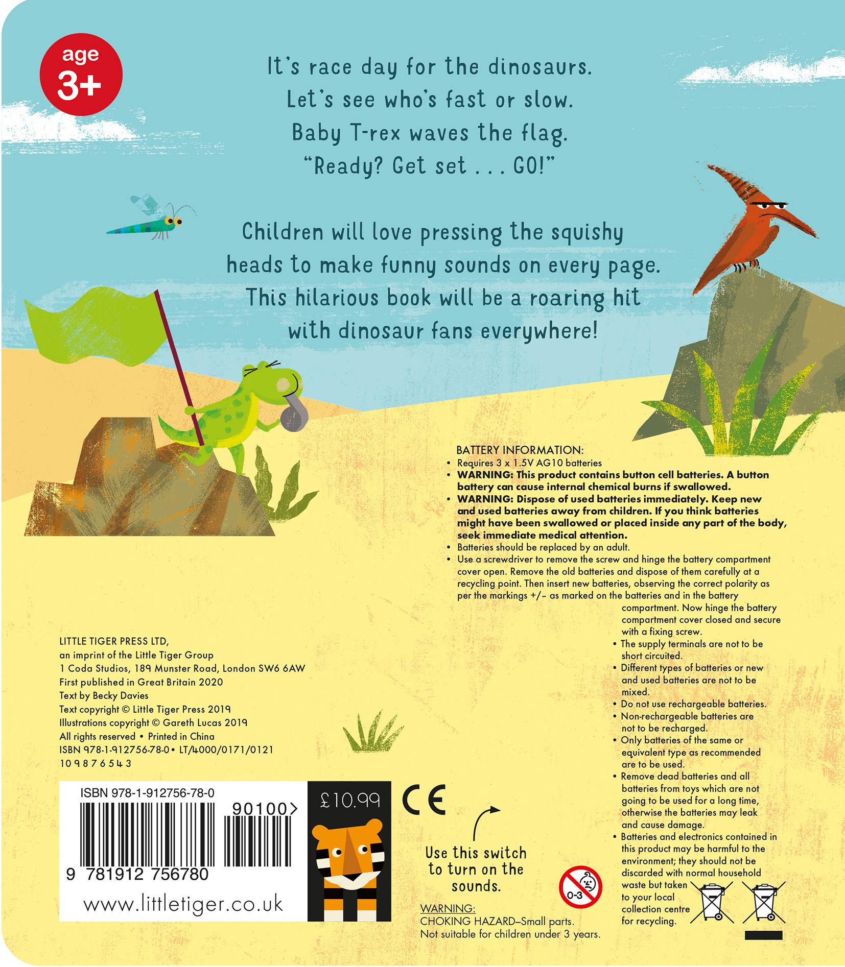 It's race day for the dinosaurs. Let's see who's fast or slow! Baby T-Rex waves the flag. Ready? Get set . . . GO! Children will love pressing the squishy heads to hear the dinosaurs sounds in this funny, rhyming book! Sure to be a roaring hit with dinosaur fans everywhere.
