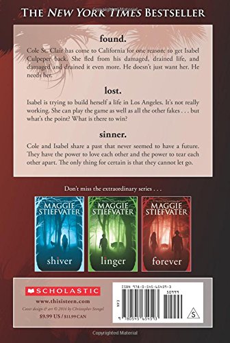 Sinner follows Cole St. Clair, a pivotal character from the #1 New York Times bestselling Shiver Series.found.Cole St. Clair has come to California for one reason: to get Isabel Culpeper back. She fled from his damaged, drained life, and damaged and drained it even more. He doesn't just want her. He needs her.lost.Isabel is trying to build herself a life in Los Angeles. It's not really working. She can play the game as well as all the other fakes. But what's the point? What is there to win?sinner.Cole and Isabel share a past that never seemed to have a future. They have the power to love each other and the power to tear each other apart. The only thing for certain is that they cannot let go.