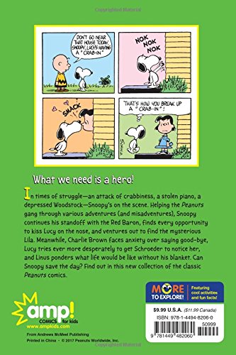 When the world needs a laugh, Snoopy is here to save the day in this collection of Peanuts comics for kids!What we need is a hero! In times of struggle–an attack of crabbiness, a stolen piano, a depressed Woodstock—Snoopy’s on the scene. Helping the Peanuts gang through various adventures (and misadventures), Snoopy continues his standoff with the Red Baron, finds every opportunity to kiss Lucy on the nose, and ventures out to find the mysterious Lila. Meanwhile, Charlie Brown faces anxiety over saying good-bye, Lucy tries ever more desperately to get Schroeder to notice her, and Linus ponders what life would be like without his blanket. Can Snoopy save the day? Find out in this collection of the classic Peanuts comics.