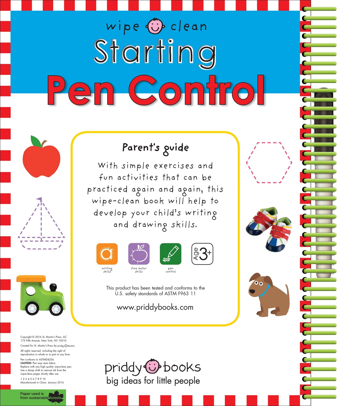 Roger Priddy's Wipe Clean: Starting Pen Control provides a wonderful introduction to writing for your little one.Holding and using a pen effectively are key skills for children to learn and master as the first steps towards learning how to write. This big, wipe-clean book is full of great pen control exercises and activities for your child to complete, starting with simple line drawing, and progressing to more complex dot-to-dot puzzles, trails, and mazes as they grow in confidence. As the pages wipe clean, and the book comes with a special dry-wipe pen, all of the exercises can be completed, wiped away and repeated, time and time again.