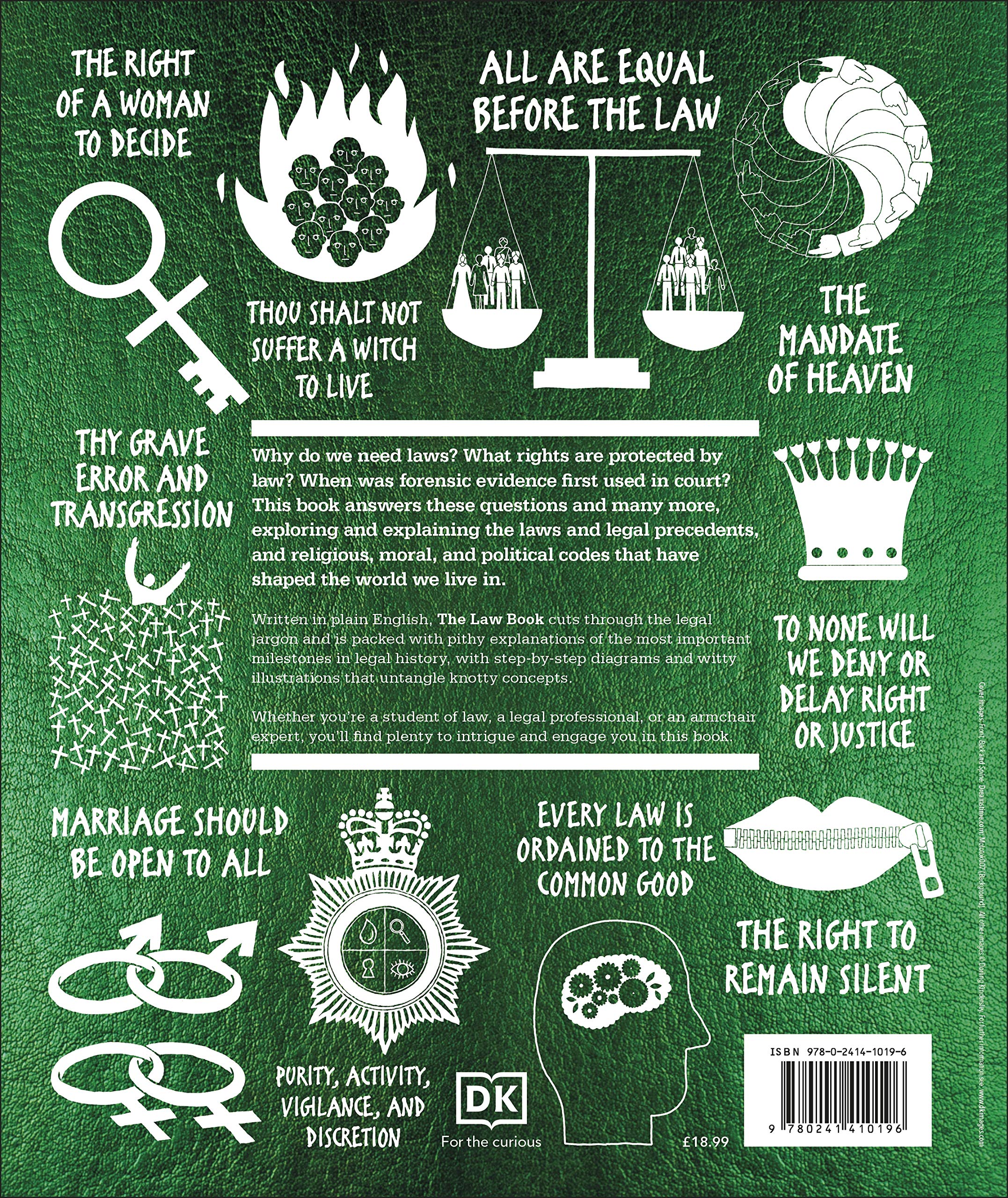 Why do we need laws? What rights are protected by law? When was forensic evidence first used in court?This book explores big questions like these, explaining the laws and legal precedents, and religious, political, and moral codes that have shaped the world we live in. Written in plain English, The Law Book cuts through the legal jargon and is packed with pithy explanations of the most important milestones in legal history, with step-by-step diagrams and witty illustrations that untangle knotty concepts.From the earliest laws, such as the Code of Hammurabi, through groundbreaking legislation including Magna Carta and the Abolition of the Slave Trade Act, The Law Book offers an engaging overview of legal history across the world all the way into the 21st century with copyright in the digital age, same-sex marriage, and the "right to be forgotten". Covering the fight for universal suffrage and workers' rights, and the establishment of international legal bodies like INTERPOL and the European Court of Justice, The Law Book explains the stories behind each milestone development.Continuing the Big Ideas series' trademark combination of authoritative, informative text, and bold graphics, The Law Book uses an innovative visual approach to make the subject accessible to everyone, whether you're a law student, a legal professional, or an armchair expert.