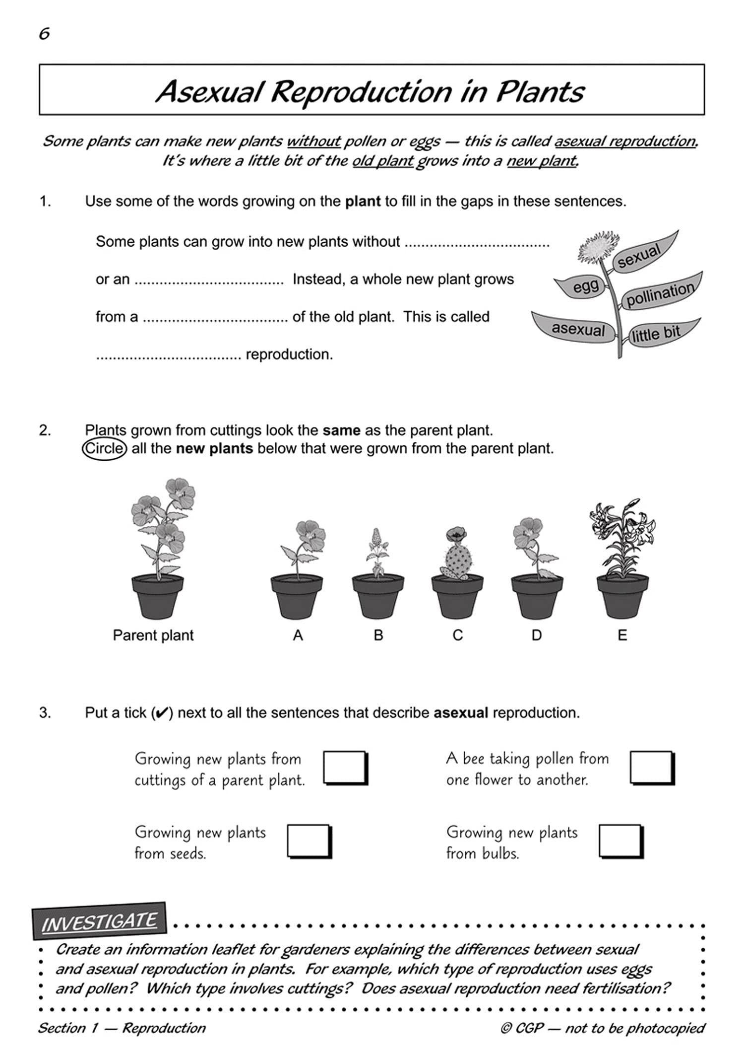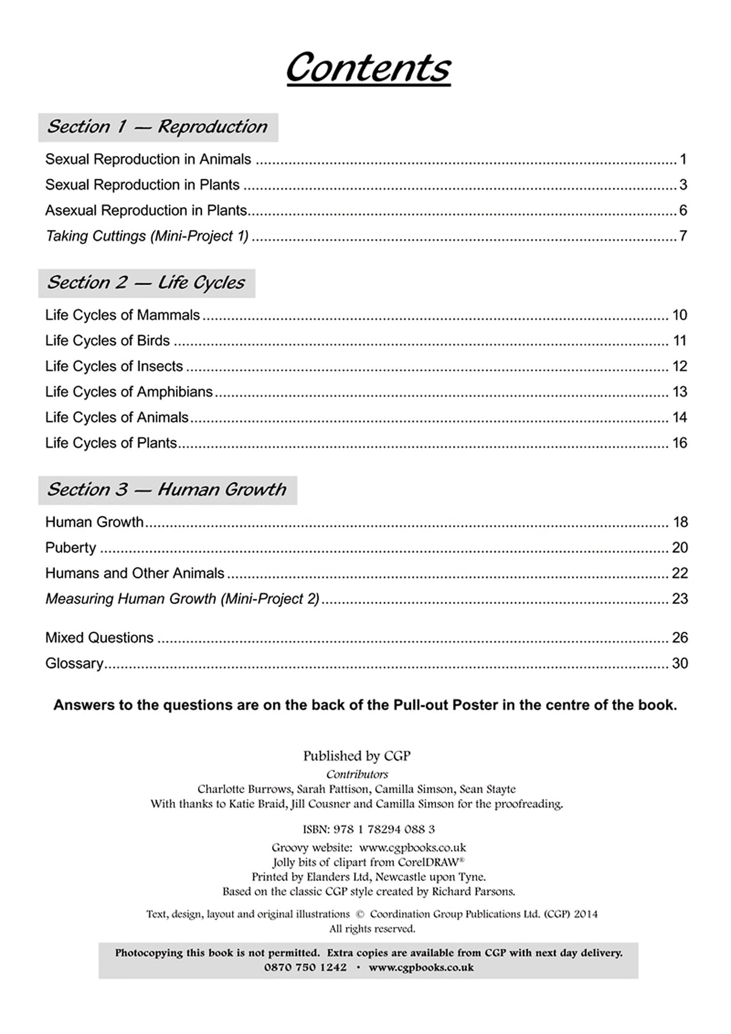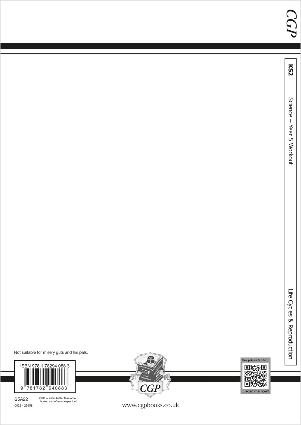 This CGP Workout book is packed with practice covering everything Year 5 (ages 9-10) pupils need to know about Life Cycles and Reproduction - all clearly laid out with plenty of space for writing answers. There’s a range of questions for each topic, with a mixed section at the end of the book that tests children on everything they’ve learned. Practical mini-projects are also included to help them develop their scientific investigation skills. Answers to every question are included on the pull-out centre pages, along with a useful A3 poster that pupils can colour in. CGP Year 5 Science Workout books are also available for: Properties and Changes of Materials (9781782940890), The Earth and Space (9781782940906) and Forces and Mechanical Devices (9781782940913).