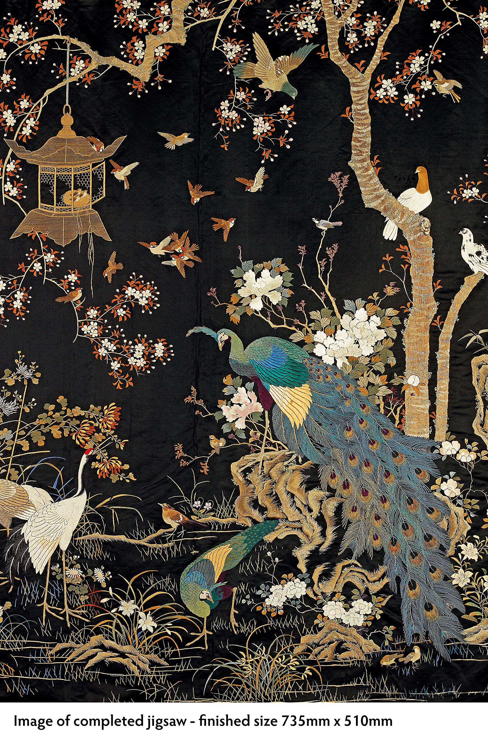Part of an exciting series of sturdy, square-box 1000-piece jigsaw puzzles from Flame Tree, featuring powerful and popular works of art. This new jigsaw will satisfy your need for a challenge, with the charming Embroidered Hanging with Peacock. This 1000 piece jigsaw is intended for adults and children over 13 years. Not suitable for children under 3 years due to small parts. Finished Jigsaw size 735 x 510mm/29 x 20 ins. Now includes an A4 poster for reference.The peacock was emblematic not of glory but of compassion and care, and so it would appear to be in this intricate hanging. What we might expect to be its show-stealing splendour is almost upstaged by the pure-white peonies, lilies and roses all around. The eyes of its furled-up tail, though beautiful, blend into the background as though they were another flower.