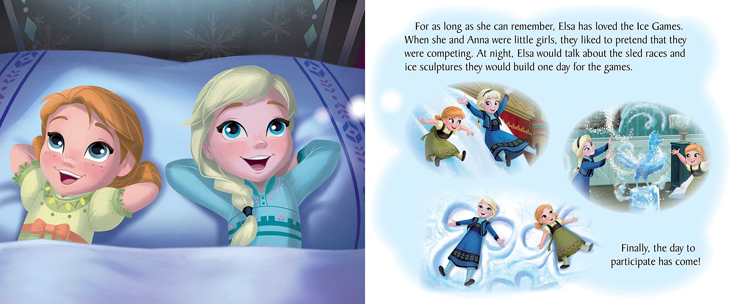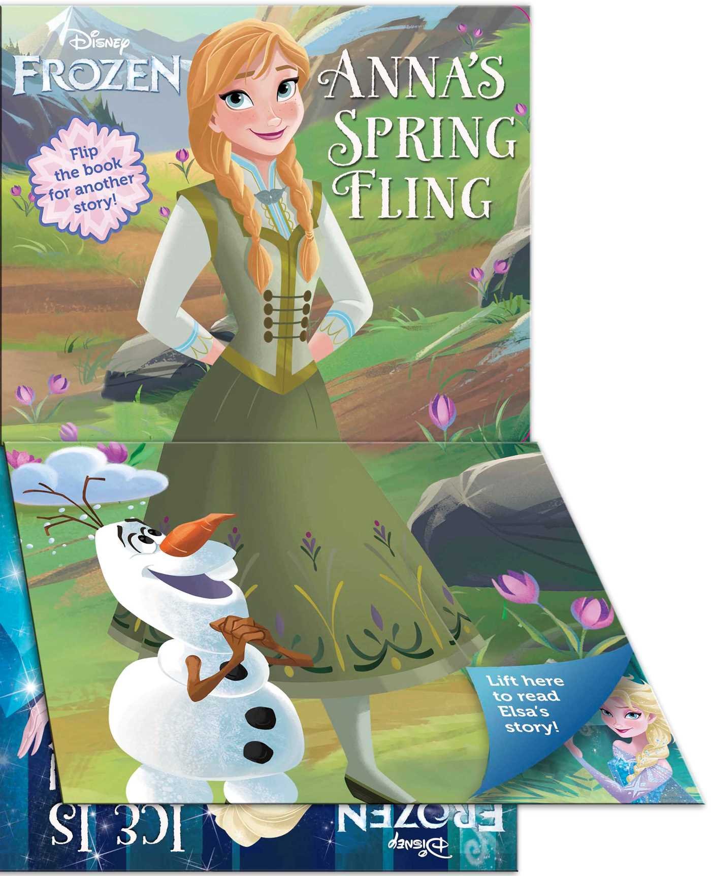 Containing two new Disney Frozen stories, this board book is really two books in one! Flip the flap one way and read Elsa's story. Flip it the other way and read Anna's story.Flip the flap to read Elsa's story, Ice Is Nice, in where she has always dreamed of participating in the annual Ice Games. This year she teams up with Anna and Kristoff for a day of fun and sportsmanship. In the end, she recognizes that working as a team was the best part of the day. Flip the flap the other way, to read Anna's story about the Spring Fling parade in Arendelle.  This year, Elsa wants Anna to ride the parade horse in front of the procession. None of the horses in the royal stable seem quite right, so Kristoff offers Sven for the task. It's a dream come true for Anna.