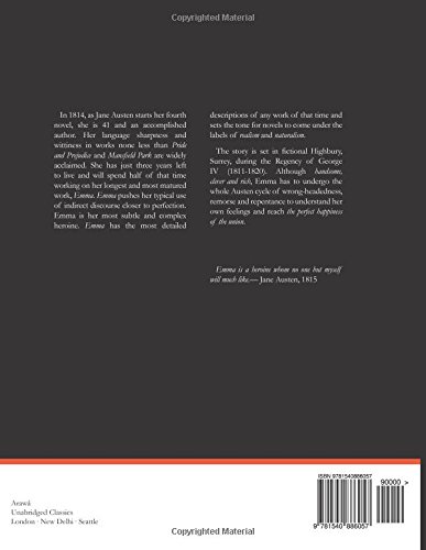 Unabridged, 8.5" x 11" edition (21.59 x 27.94 cm) with small type (9-point) and three column format on cream paper.1814, as Jane Austen starts her fourth novel, she is 41 and an accomplished author. Her language sharpness and wittiness in works none less than Pride and Prejudice and Mansfield Park are widely acclaimed. She has just three years left to live and will spend half of that time working on her longest and most matured work, Emma. Emma pushes her typical use of indirect discourse closer to perfection. Emma is Austen's most subtle and complex heroine. Emma has the most detailed descriptions of any work of that time and sets the tone for novels to come under the labels of realism and naturalism. The story is set in fictional Highbury, Surrey, during the Regency of George IV (1811-1820). Although handsome, clever and rich, Emma has to undergo the whole Austen cycle of wrong-headedness, remorse and repentance to understand her own feelings and reach the perfect happiness of the union. Emma is a heroine whom no one but myself will much like.— Jane Austen, 1815