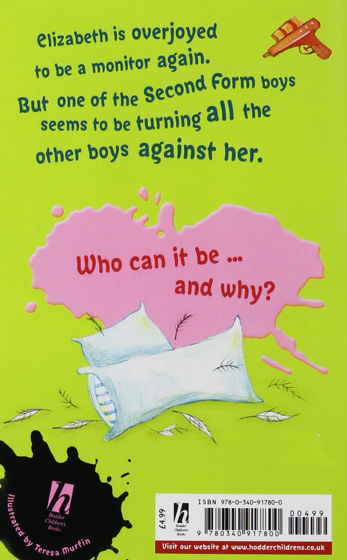 Elizabeth is a monitor again, but she might not be for very long. She notices Jake's ankle has suddenly got better and she gives the game away to the games master after he's miserable about the team losing 6-0. Horrid notes soon appear in her desk and pillow fights erupt. She begins to think Jake is the author of the notes, but after a spelling test notices something "Hey", she thinks "wasn't the resign spelt correctly on the most recent note?" She finds out it was, so Jake wasn't the author and she soon notices Jake moping around as white as a sheet. She goes to him and says "Jake, what's going on here? Why don't you want to play in the match? Please, please tell me. I hate to see you like this; it makes me want to cry myself" "I nearly blinded my coach about a month ago, and I'm terrified of it happening again. Please, PLEASE don't make me play", and you'll have to read the rest to find out what happens