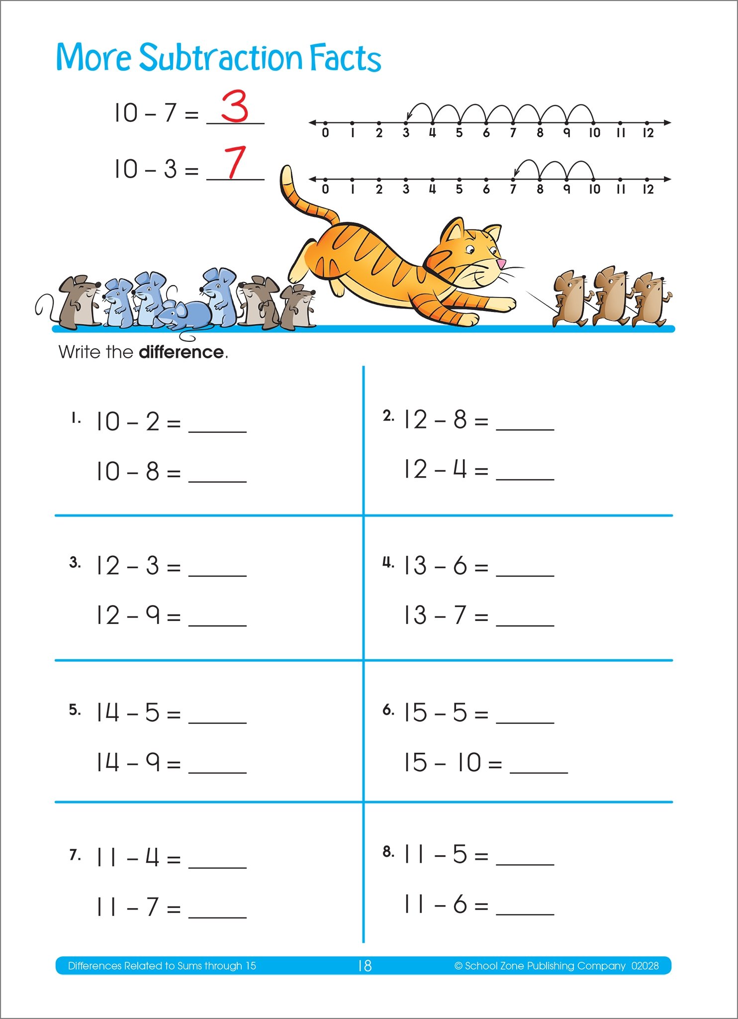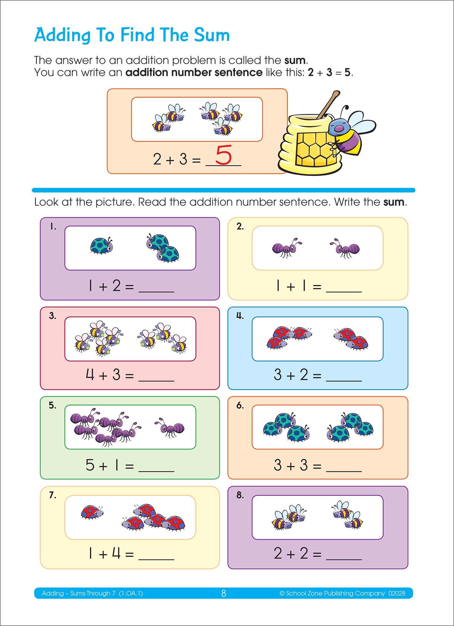 Visit the School Zone store at Amazon.com/SchoolZonePublishing.BOOK FEATURES32 pages: 29 activity pages, 2 answer key pages, 1 award certificateFor ages 6-77.75" x 10.75" pages with durable glossy coverBook features multiple skills: Addition & Subtraction, Greater than & Less than, Place Value, Numerical Order, and More!Clear examples, instructions, and goals help kids master and retain new math concepts Whimsical, colorful illustrations help kids focus and stay motivated Follows NCTM and Common Core standards Portable and perfect for on-the-go learning! AMAZING - All learning begins with the basics. This first grade math workbook will help prepare children for future math success as they count, add, subtract, and learn numbers’ place values. A big part of basic math involves discovering and recognizing sets and patterns, and the fun-friendly drawings in this 1st grade math workbook help ease anxieties as math becomes colorful and more realistic. Let a pair of busy bunnies or a trio of math-loving penguins point the way. Math Basics 1 from the I Know It! series follows Common Core and NCTM (National Council for Teachers of Mathematics (NCTM) standards, and the slim 32-page size is handy for packing into totes, backpacks and luggage. This kind of enjoyable reinforcement learning is perfect as both a school aid, or as a great addition to your kids homeschool curriculum.WORKBOOKS FOR KIDS - Using kids workbooks is a great way to improve learning. Writing by hand, as opposed to typing on a computer, fires up specific areas of a child's brain, improving their ability to not only remember what he or she learns but to think of new ideas. When kids finish the workbook, you can fill out the included “Great Job! You’re #1” completion certificate to reward a job well done. PREPARATION - Let us help you prepare your young children for the next grade level with our workbooks, flashcards, card games, early reading books, and online learning program – Anywhere Teacher. Keep kids "classroom ready" with these great supplemental learning tools and more!AWARD WINNING - School Zone content has won The Parents’ Choice Foundation Award, Tillywig Toy Awards, Brainchild Award, Family Choice Award, Mom's Choice Awards Honoring Excellence, Gold Star Toy Scholastic Parent and Child Award and many more.OUR STORY - More than 40 years ago, long-time educators James Hoffman, Ed.D., and his wife Joan Hoffman, M.A., began a retail supply outlet for teachers, then soon identified a need for at-home learning materials to help parents support and supplement their children’s classroom instruction. School Zone Publishing fast emerged as the market leader in workbooks and flashcards for preschoolers through sixth graders.School Zone remains family-owned, focused on excellence, responsive to customers, alert to emerging technology, and committed to the community. We continually update our products with new features and content, reflective of changing standards, evolving teaching methods, and overall best practices.