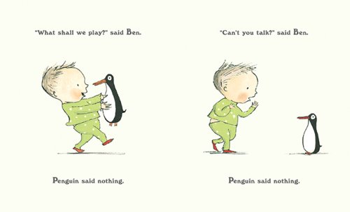 A quirky new tale from a rising talent — in which a bossy little boy receives a surprising comeuppance.When Ben rips open his present, he finds a penguin inside. "Hello, Penguin!" he says. "What shall we play?" But Penguin says nothing. Even when Ben tickles its belly, sings a funny song, does a dizzy dance, stands on his head, sticks out his tongue, and resorts to increasingly rude and drastic measures, Penguin makes no response. What will it take for Penguin to say something — or for Ben to understand what Penguin has to say? Fresh, spare illustrations bring whimsy to this wonderful tale, in which a silent Penguin turns marvelously eloquent and a little boy finally gets his heart’s desire.