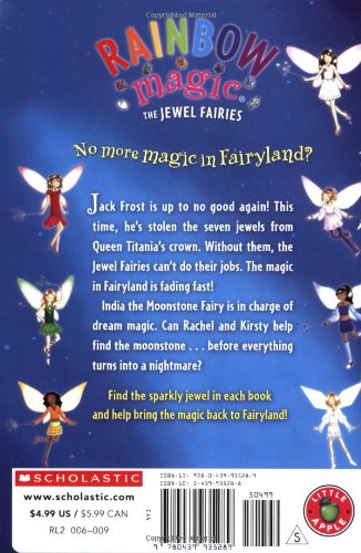 Seven jewels have been stolen from the Fairy Queen's crown! Without them, the Jewel Fairies' magical powers are fading. Read all seven books to find the jewels and save the fairies!Jack Frost is up to no good again! This time, he's stolen the seven jewels from Queen Titania's crown. Without them, the Jewel Fairies can't do their jobs. The magic in Fairyland is fading fast!India the Moonstone Fairy is in charge of dream magic. Can Rachel and Kirsty help find the moonstone . . . before everything turns into a nightmare?Find the sparkly jewel in each book and help bring the magic back to Fairyland!