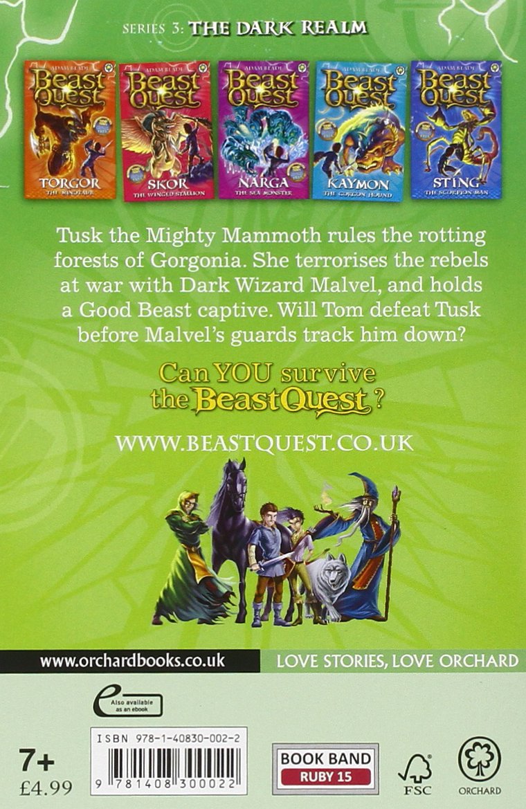 Tusk the Mighty Mammoth rules the rotting forests of Gorgonia. She terrorises the rebels at war with evil wizard Malvel and holds a good Beast captive. All the good Beasts are imprisoned and Tom must save them. Will he defeat Tusk before Malvel's guards track him down?Don't miss:TORGOR THE MINOTAUR - SKOR THE WINGED STALLION - NARGA THE SEA MONSTER - KAYMON THE GORGON HOUND - STING THE SCORPION MAN
