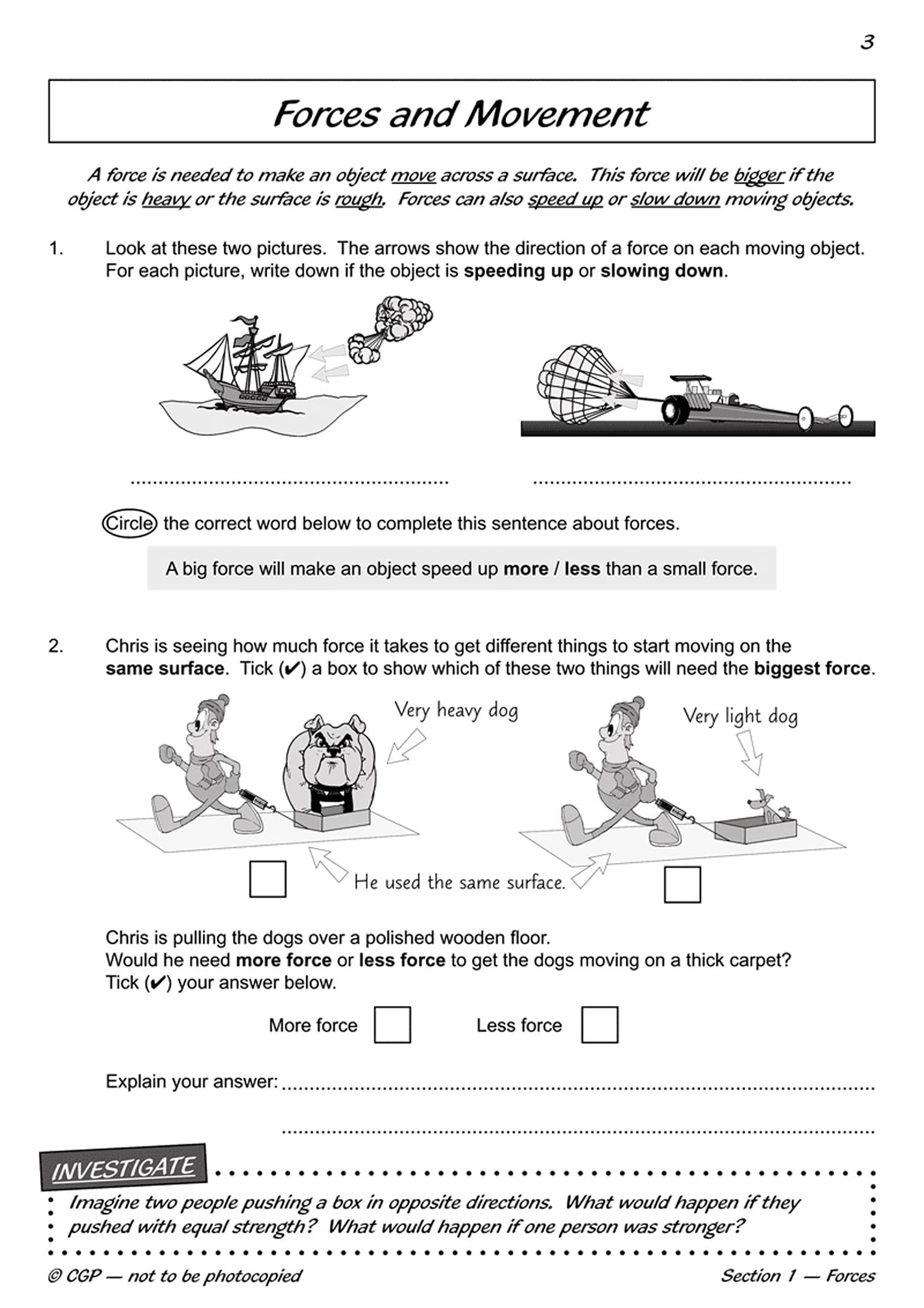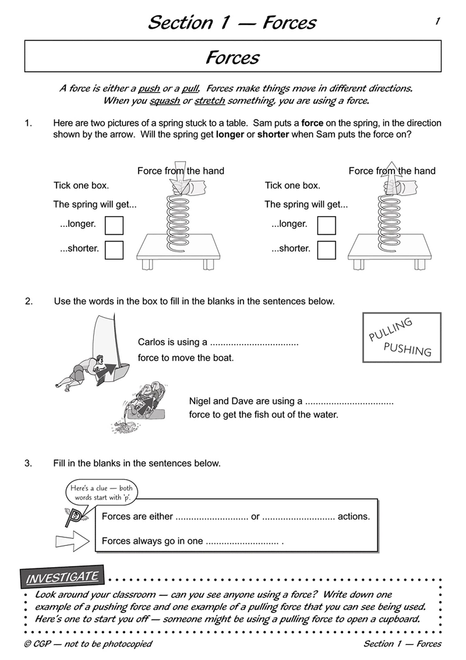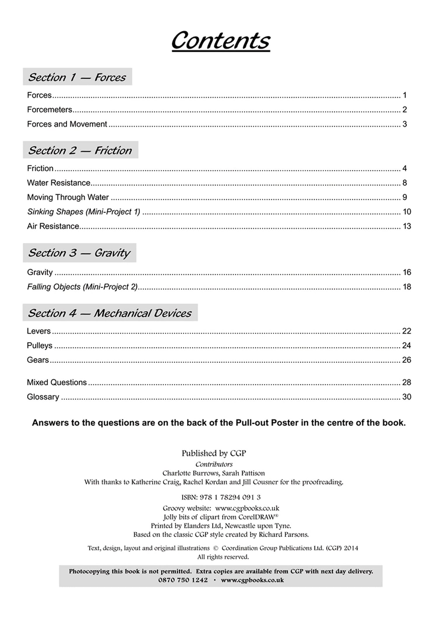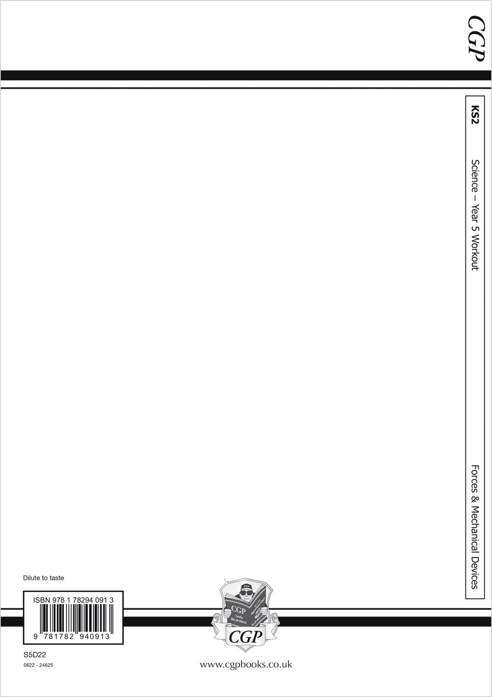 This CGP Workout book is packed with practice covering everything Year 5 (ages 9-10) pupils need to know about Forces and Mechanical Devices - all clearly laid out with plenty of space for writing answers. There’s a range of questions for each topic, with a mixed section at the end of the book that tests children on everything they’ve learned. Practical mini-projects are also included to help them develop their scientific investigation skills. Answers to every question are included on the pull-out centre pages, along with a useful A3 poster that pupils can colour in. CGP Year 5 Science Workout books are also available for: Life Cycles and Reproduction (9781782940883), Properties and Changes of Materials (9781782940890) and the Earth and Space (9781782940906).