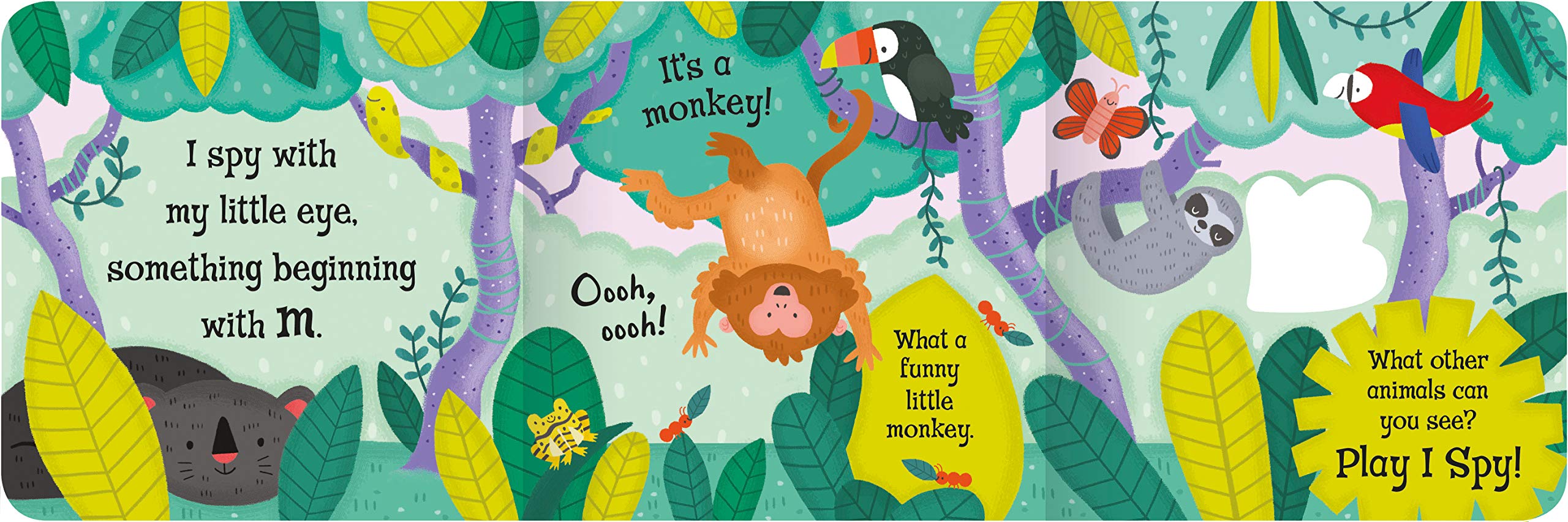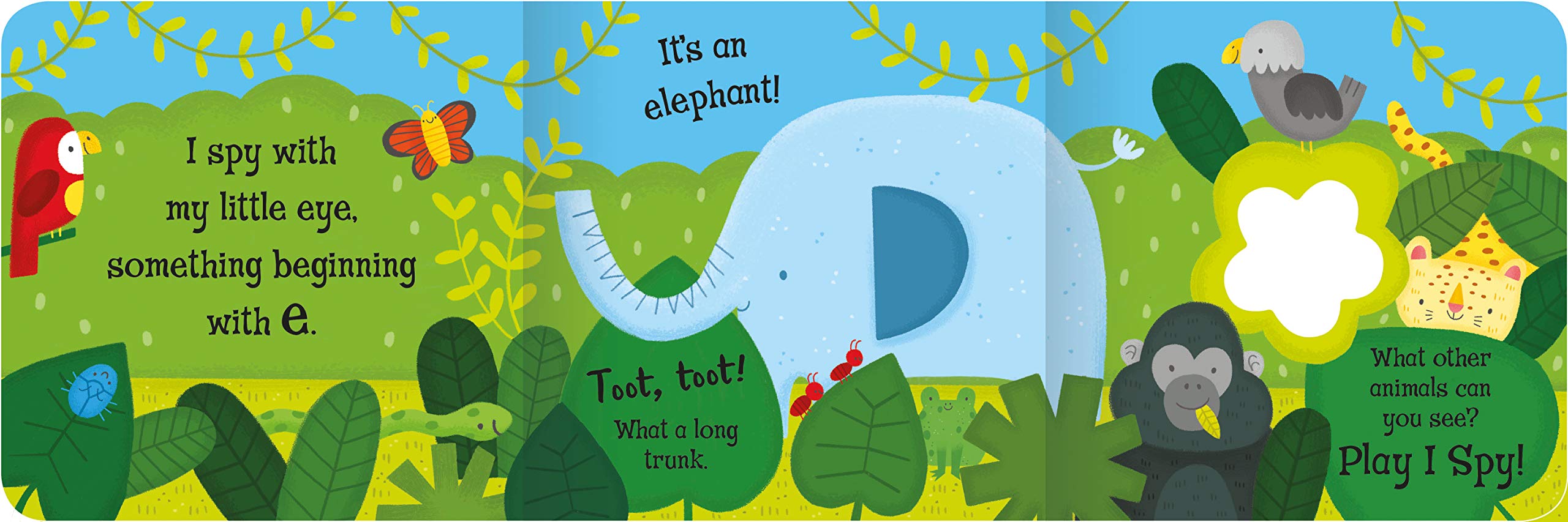 The family favourite game 'I Spy' is brought to life in this fun book - can you spot the tiger in the jungle? Giant peek-through flaps offer clues to help guessing, and there are lots of other animals to spot, too.Charming, bright illustrations will entice preschoolers who are exploring their new fascination with letters and sounds, and the sturdy peekaboo flaps will bring hours of fun! Perfect for learning essential skills through play.Also available: Spot and Say: Farm