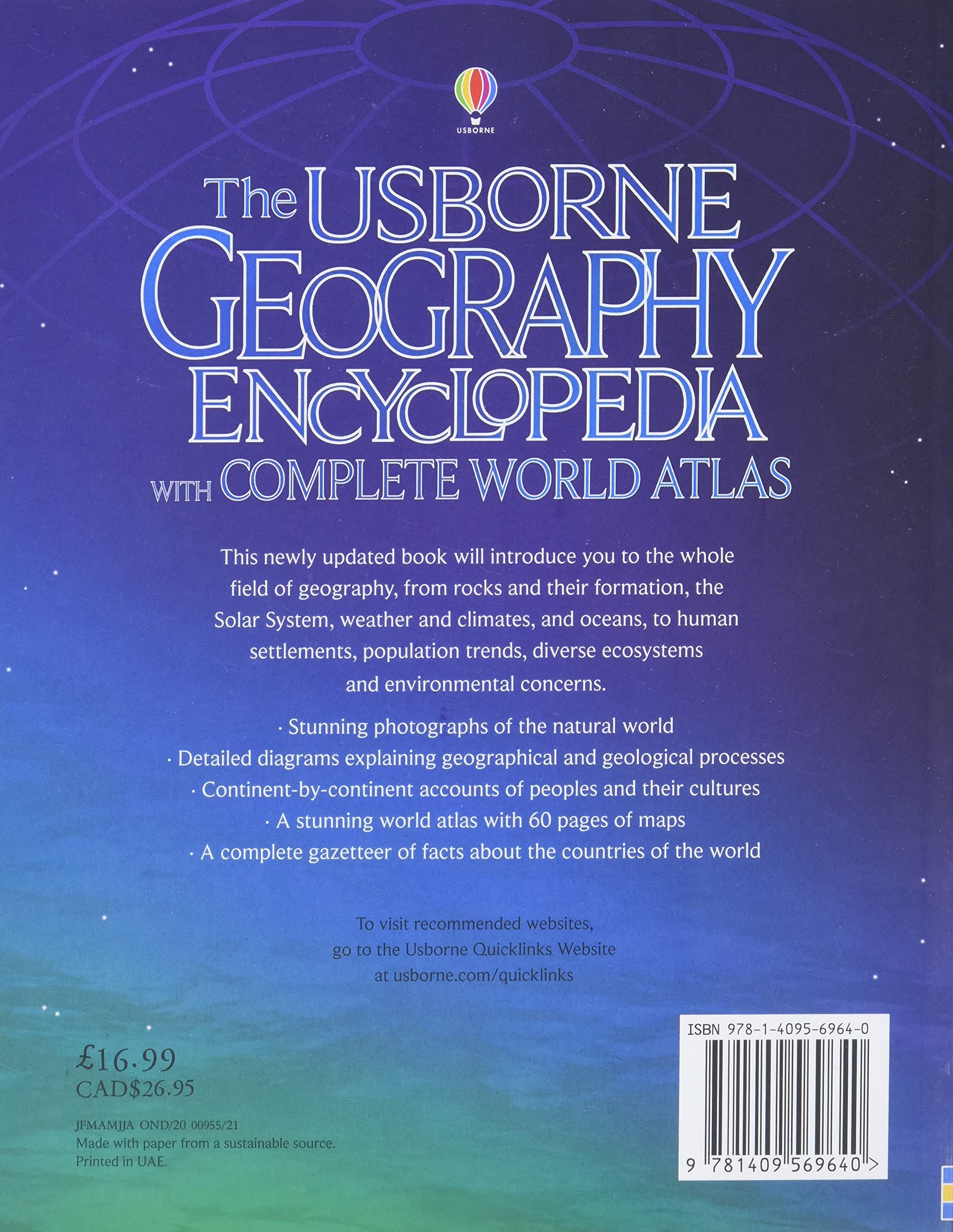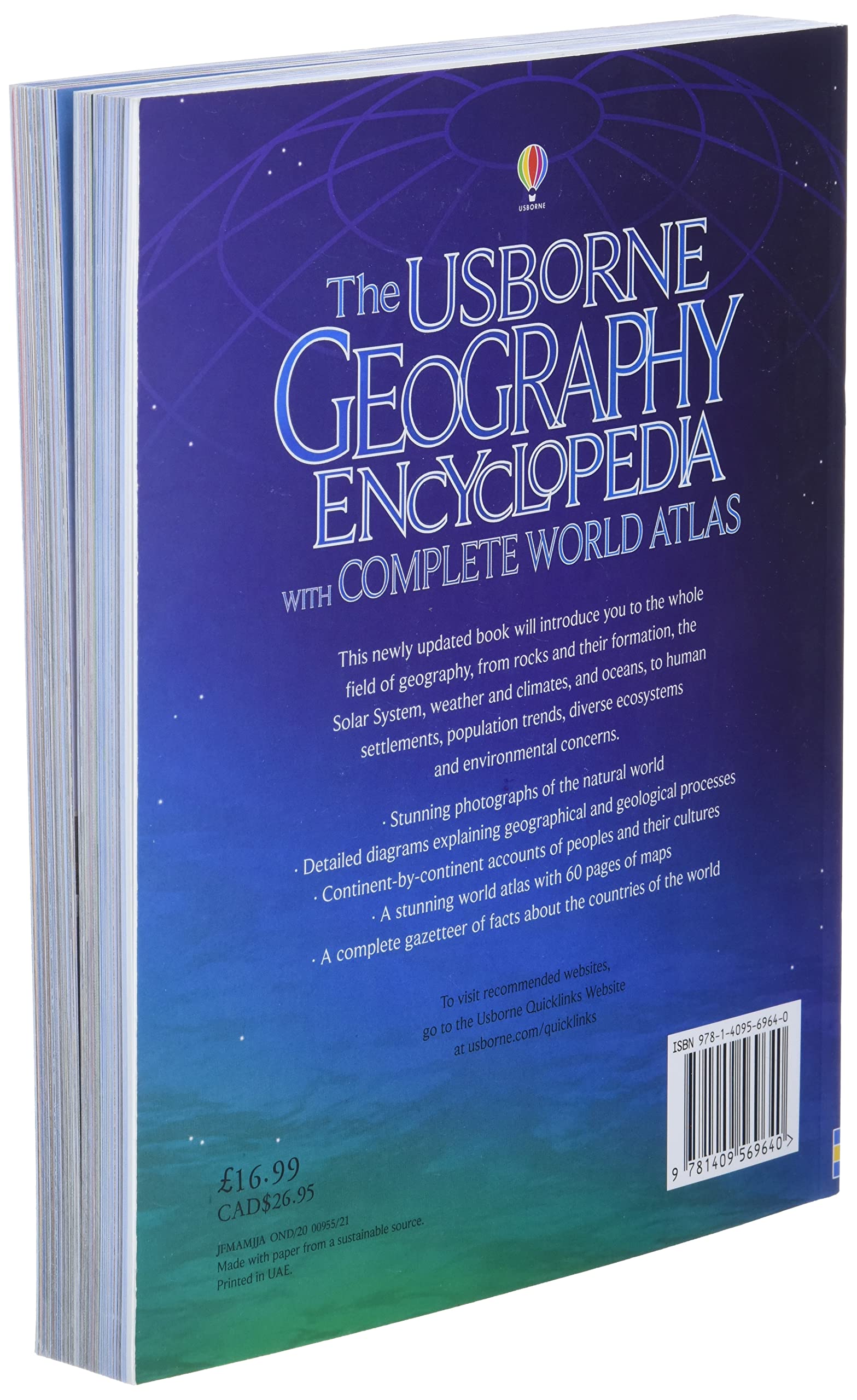 A comprehensive geography encyclopedia with complete world atlas, packed with information about our remarkable planet, from its physical characteristics to a continent-by-continent look at the world's peoples and governments. Richly illustrated with superb photographs, clear explanatory diagrams and 60 pages of detailed, up-to-date maps. Internet links via the Usborne Quicklinks Website to fascinating websites where readers can find further information, take virtual tours and lots more.